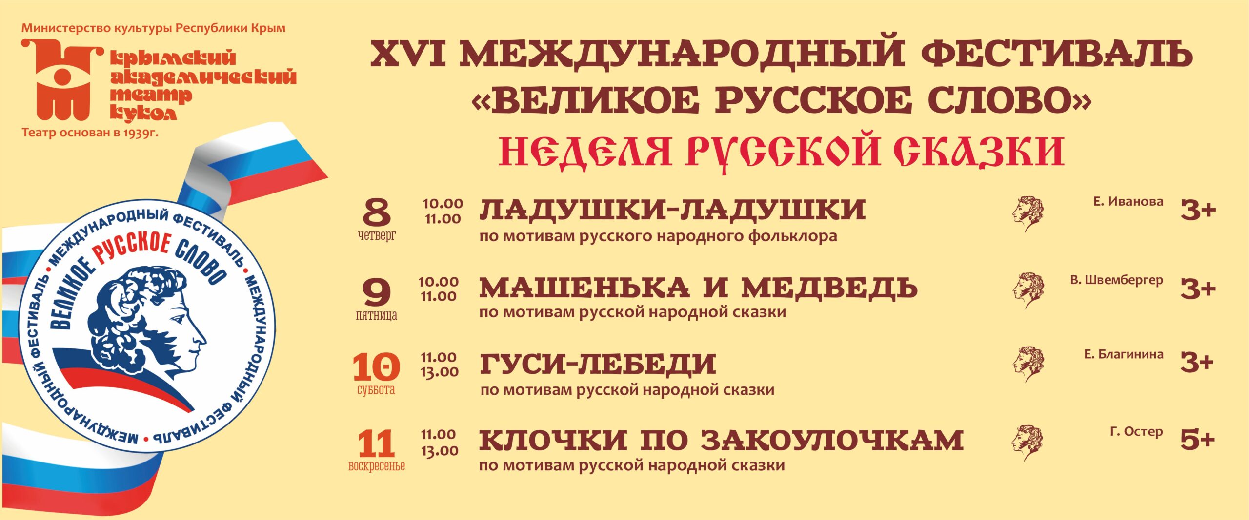 В четырнадцатый раз Крымский академический театр кукол примет участие в программе фестиваля, вовлекая в праздник культуры русского народа самых маленьких крымчан, для которых проведёт «Неделю русской сказки».