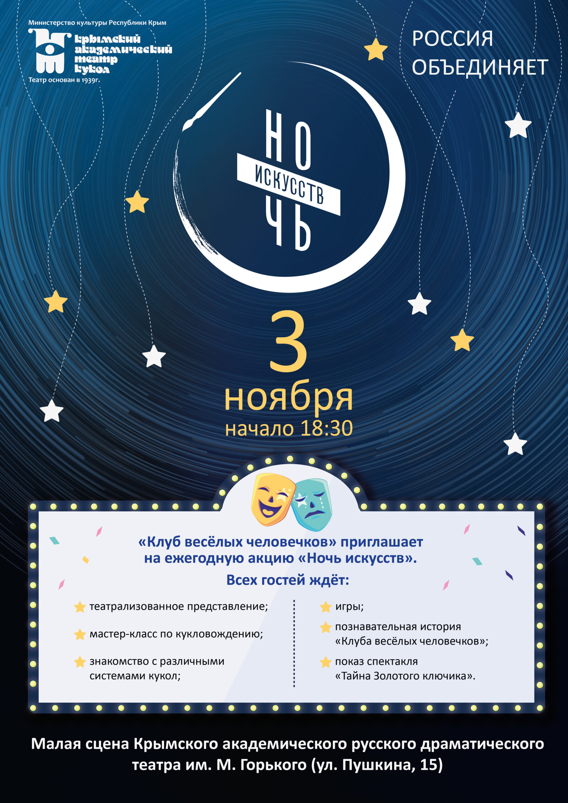 3 ноября Крымский академический театр кукол примет участие во Всероссийской акции «Ночь искусств», которая приурочена ко Дню народного единства и пройдёт под девизом «Россия объединяет».