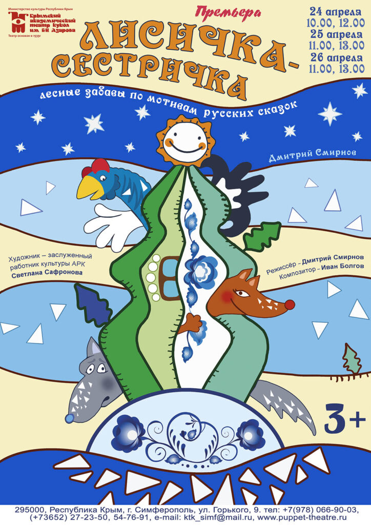 24 апреля первые зрители увидят спектакль «Лисичка-сестричка», премьеру которого представит Крымский академический театр кукол им. Б.И. Азарова. Постановка, созданная по мотивам русских народных сказок, приурочена к 200-летию собирателя русского фольклора, историка и исследователя духовной культуры славянских народов Александра Николаевича Афанасьева, автора самого большого в мире собрания сказок.